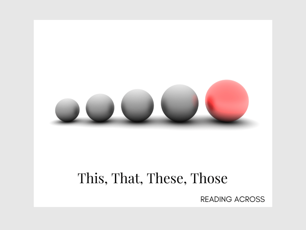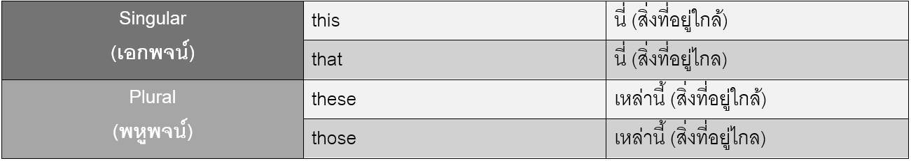 This, That / These, Those เป็นศัพท์ที่ใช้ในการบอกตำแหน่งใกล้-ไกลของสิ่งของต่าง ๆ แบ่งออกเป็น 2 กลุ่มคือ กลุ่มที่เป็นเอกพจน์ (Singular) กับกลุ่มที่เป็นพหูพจน์ (Plural) ดังนี้