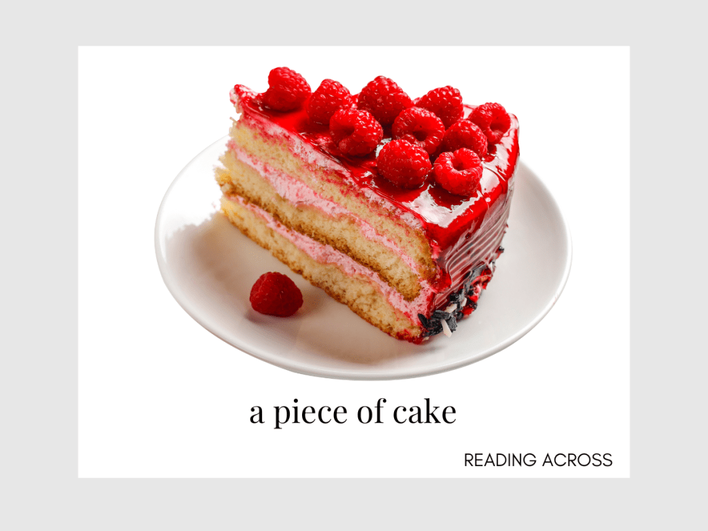 จากหัวข้อคงจะทำหลาย ๆ คนงง เอ๊ย ยังไง ทำไมเค้กถึงแปลว่ากล้วยหรือหมู จริง ๆ แล้ว “a piece of cake” เป็นสำนวนค่ะ แปลว่า ง่ายมาก หวานหมู ง่ายยิ่งกว่าปอกกล้วยเข้าปาก กล้วยมาก ซึ่งทั้งหมดทั้งมวลก็คือง่ายนั่นเองล่ะค่ะ ซึ่งเราจะใช้ “as easy as pie” ไปเลยก็ได้ มีความหมายว่าง่ายมาก ๆ เหมือนกันค่ะ
