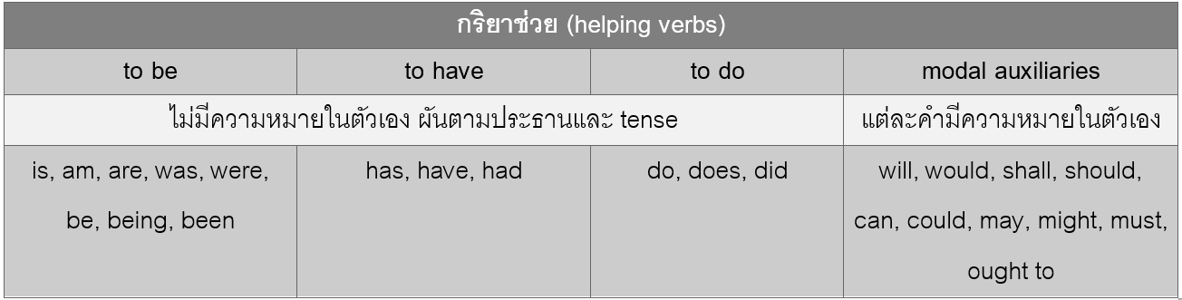 กริยาช่วย คือ กริยาที่วางอยู่หน้ากริยาหลัก (main verb) ในประโยคเสมอ มีหน้าที่ทำให้ประโยคสมบูรณ์ ตามโครงสร้างประโยคดังนี้
